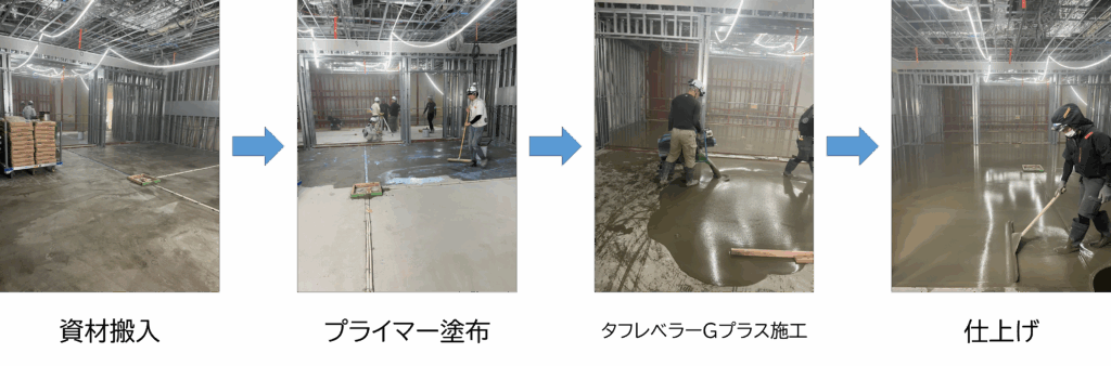 お客様(元請の内装工事業者様)との打ち合わせの結果、高強度で、速硬性に優れ、高い流動性で精密な水平面を作り出す高強度セルフレベリング材「タフレベラーGプラス」を使用して工事を行う事となりました。